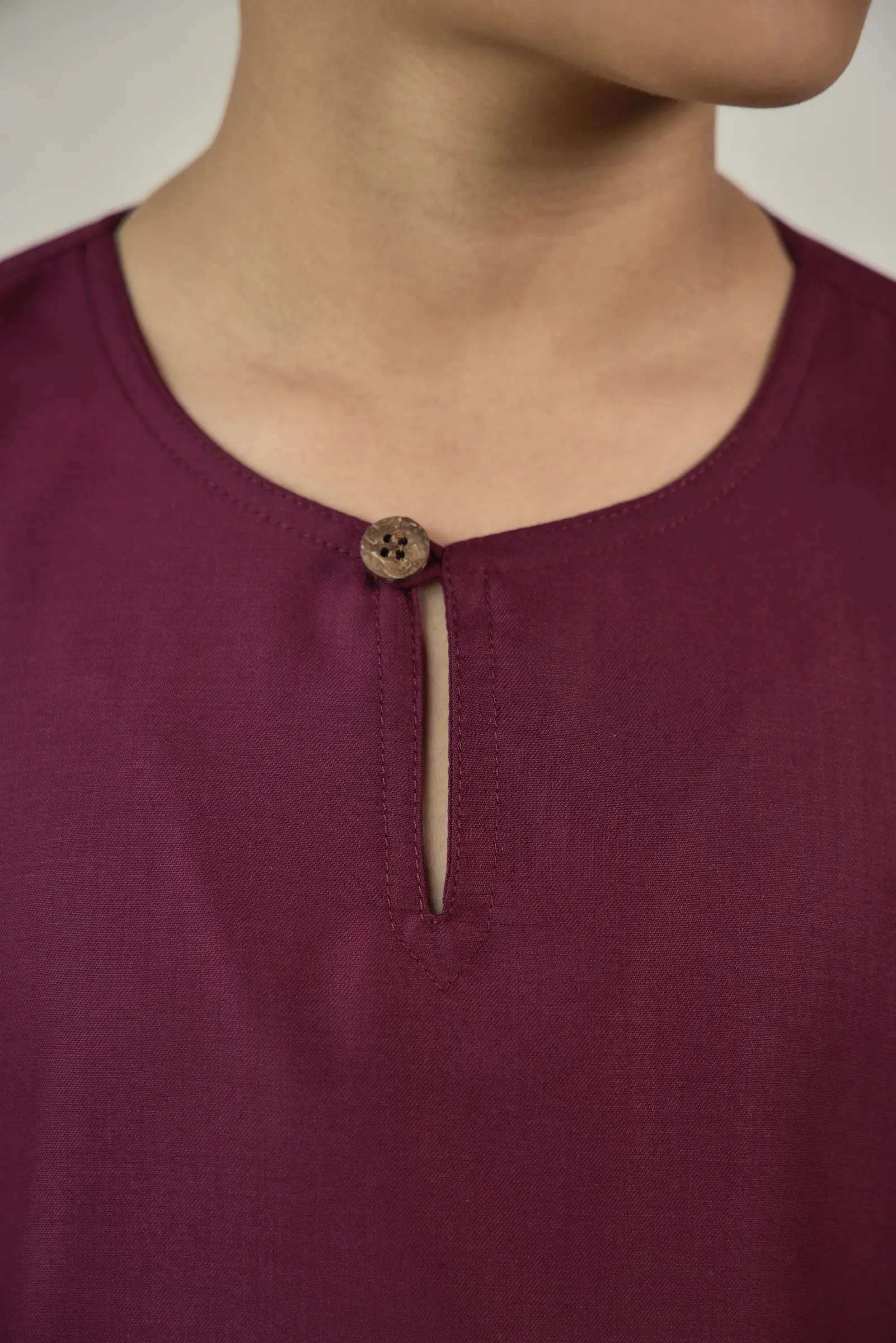 - Round neckline with wooden button